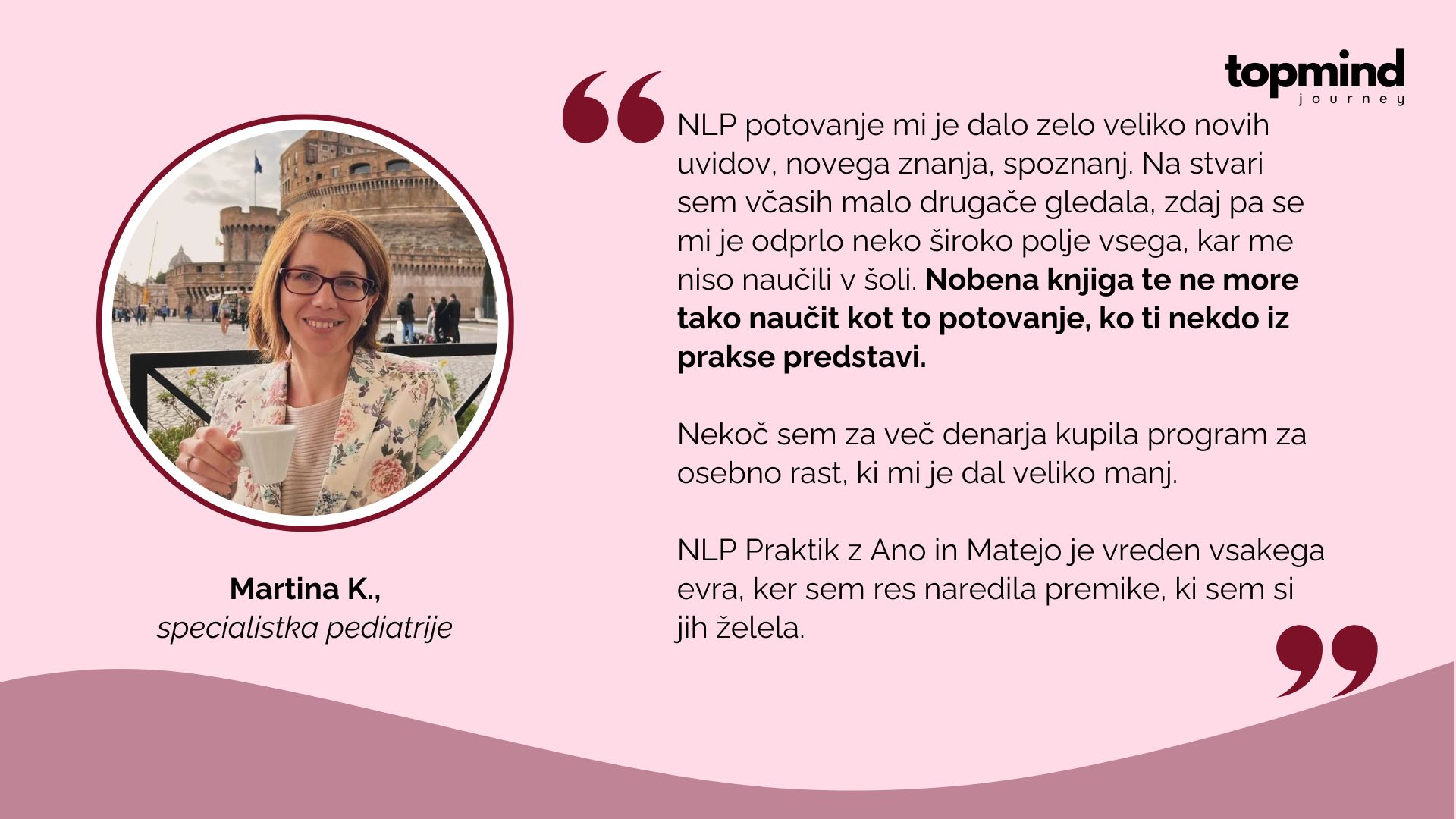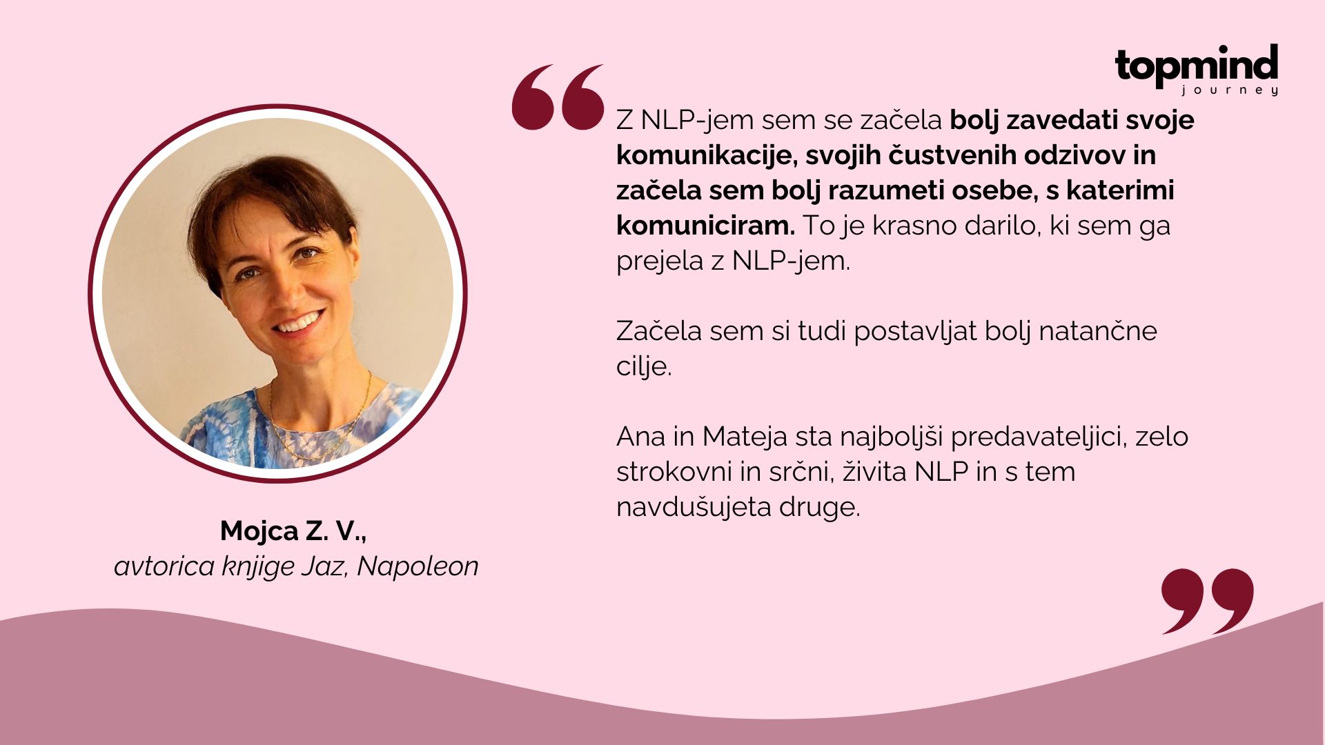 In zdaj najboljše: NLP za ženske ni teorija, ampak praksa, ki jo takoj uporabiš doma, v odnosih in pri poslu. In ker delaš v skupini žensk, ki imajo podobne izzive, dobiš še dodatno podporo, razumevanje in iskrene pogovore brez obsojanja.