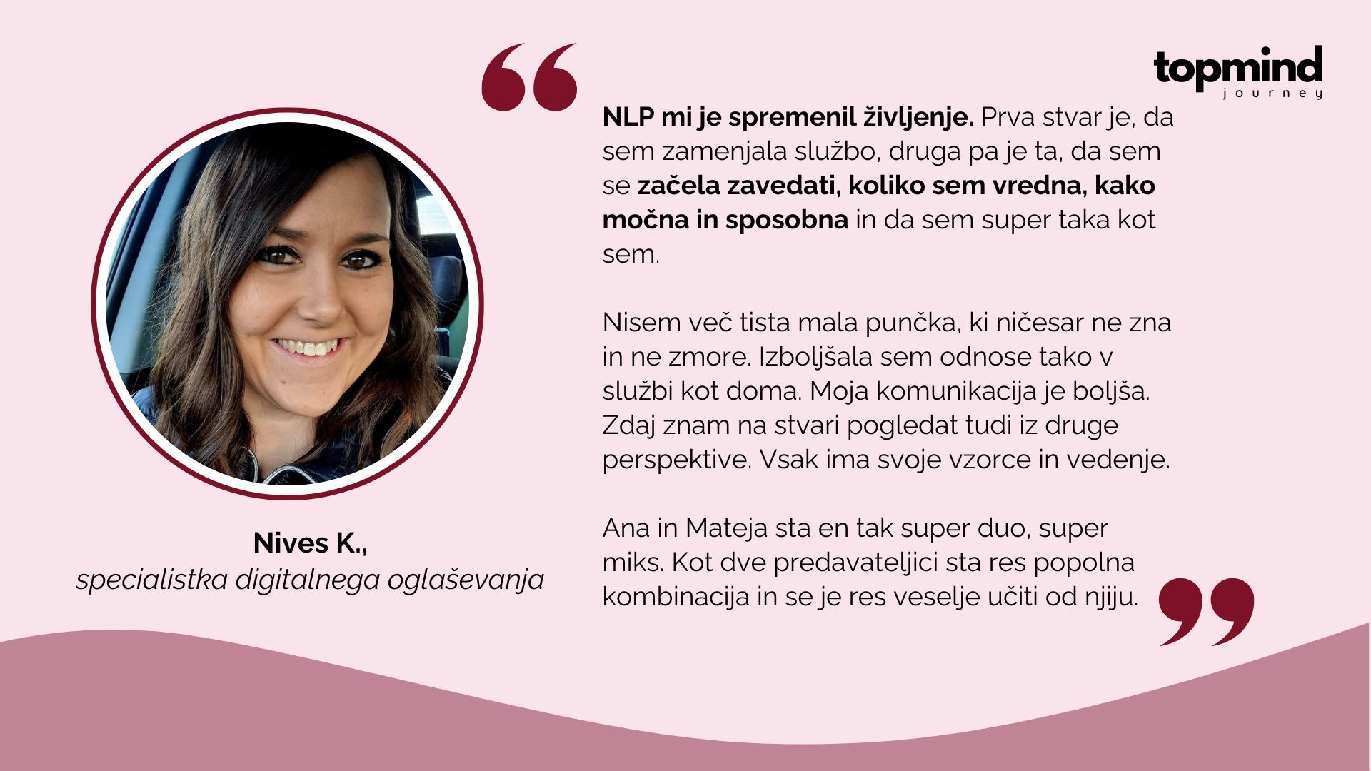 Obe sva že neštetokrat padli na finto »bom vse sama, bom vsem ustregla«, zato veva, kako dragoceno je imeti orodja, s katerimi si prihraniš živce. Če si želiš več lahkotnosti in manj prerekanja – resno, pridi z nama. Če pa želiš ostati v drami in kaosu … no, potem pa mogoče NLP ni zate 😉